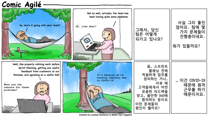 - 아무도 실제로 만날 수 없는 이런 시기에, 애자일 팀의 팀 정신을 만들고 유지하는 건 훨씬 중요합니다. 미로, 줌, 슬랙, 팀즈, 스카이프, 혹은 뭐가 되건 적절한 온라인 도구를 사용할 수 있습니다. 하지만, 적합한 온라인 도구를 갖는 건 절반의 해답일 뿐입니다. "분산된 함께하기"를 연습하는 게 (대부분의) 나머지 절반입니다.