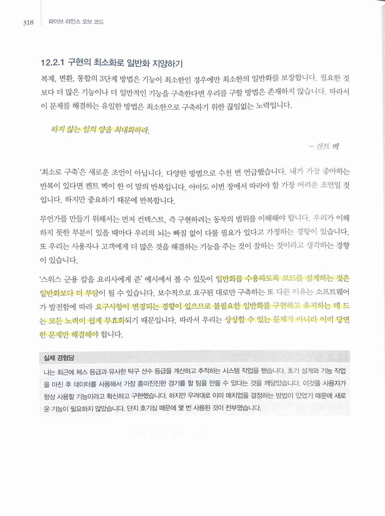 일반화를 수용하도록 코드를 설계하는 것은 일반화보다 더 부담... 요구사항이 변경되는 경향이 있으므로 불필요한 일반화를 구현하고 유지하는 데 드는 모든 노력이 쉽게 무효화... 상상할 수 있는 문제가 아니라 이미 당면한 문제만 해결해야
