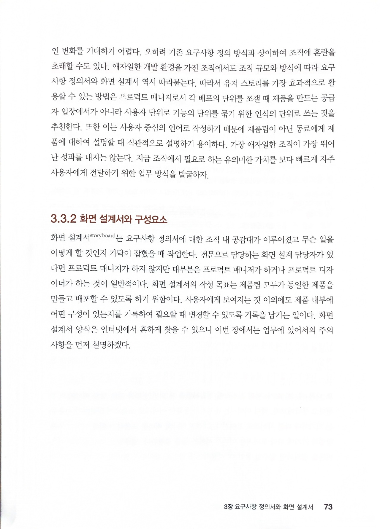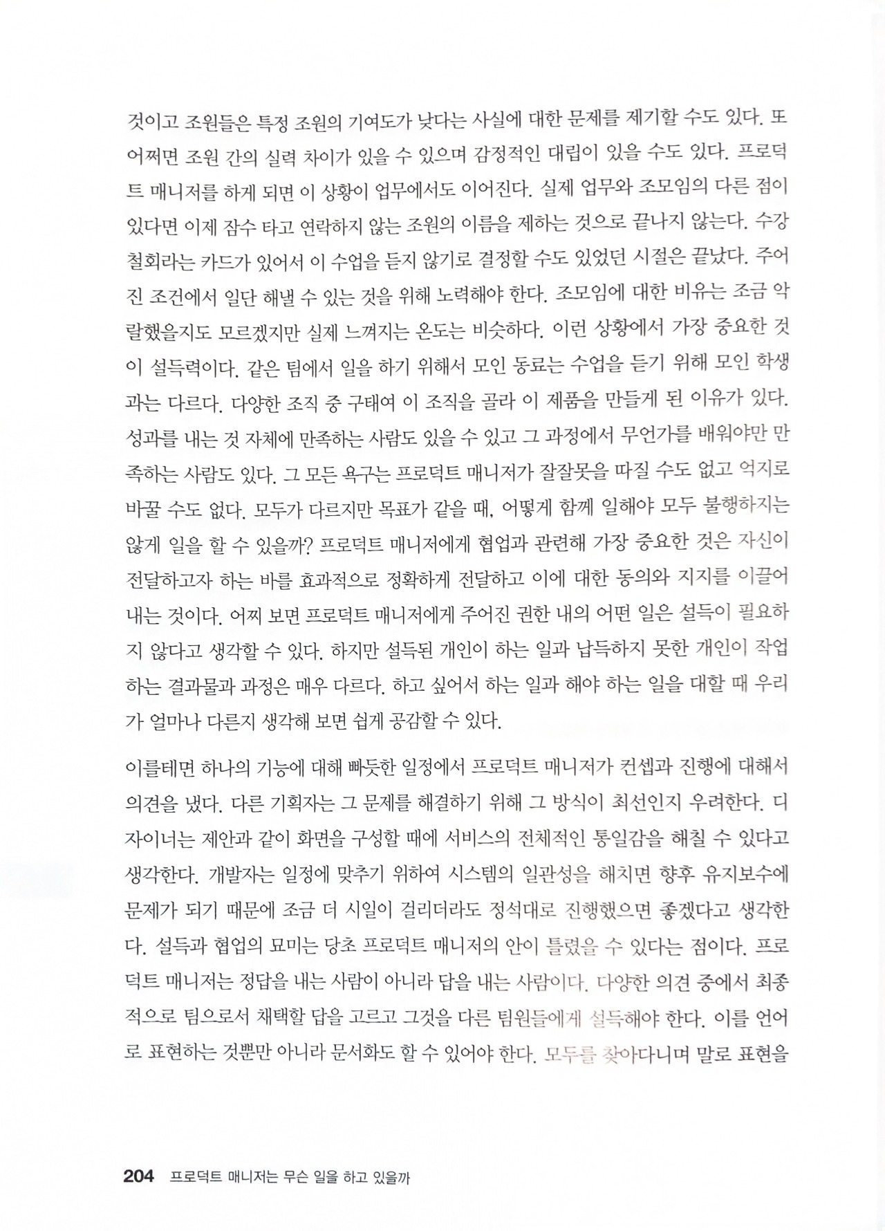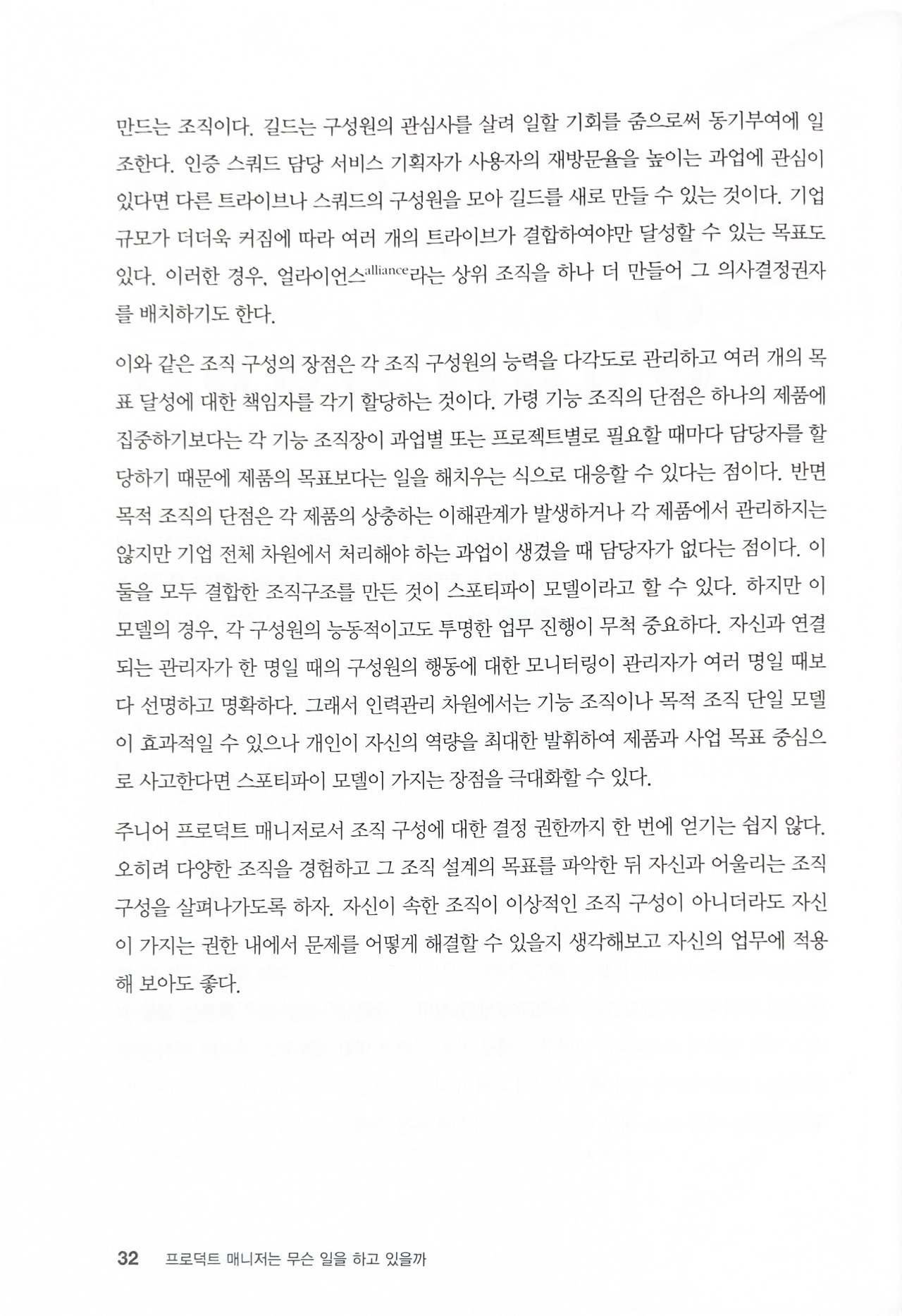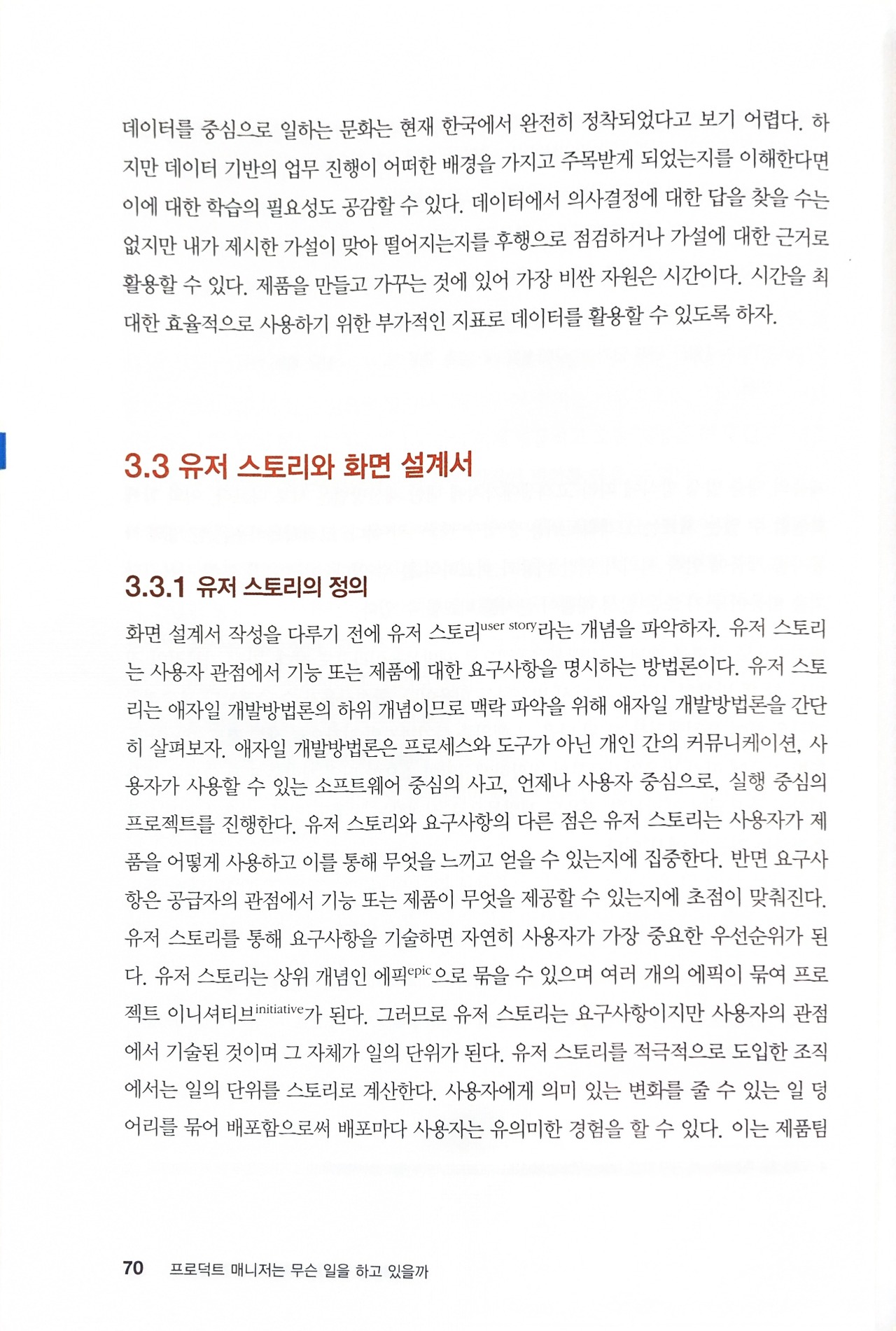 - Agile 전문 서적이 아니니 한계가 있긴 하지만, agile에 대한 언급이 매우 적고, 이에 대해 좀 전문적인 부분은 부족하다. 우리나라가 PO/PM 등의 명칭을 갖는 직책이 늘어나는 건 결국 agile, 특히 scrum의 확산과 직접적으로 연결되어 있는데, 이 분야는 매우 약하다.
