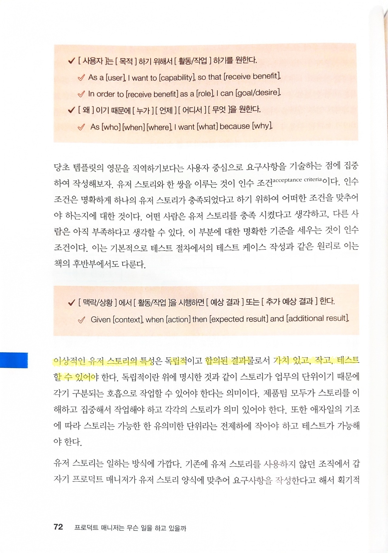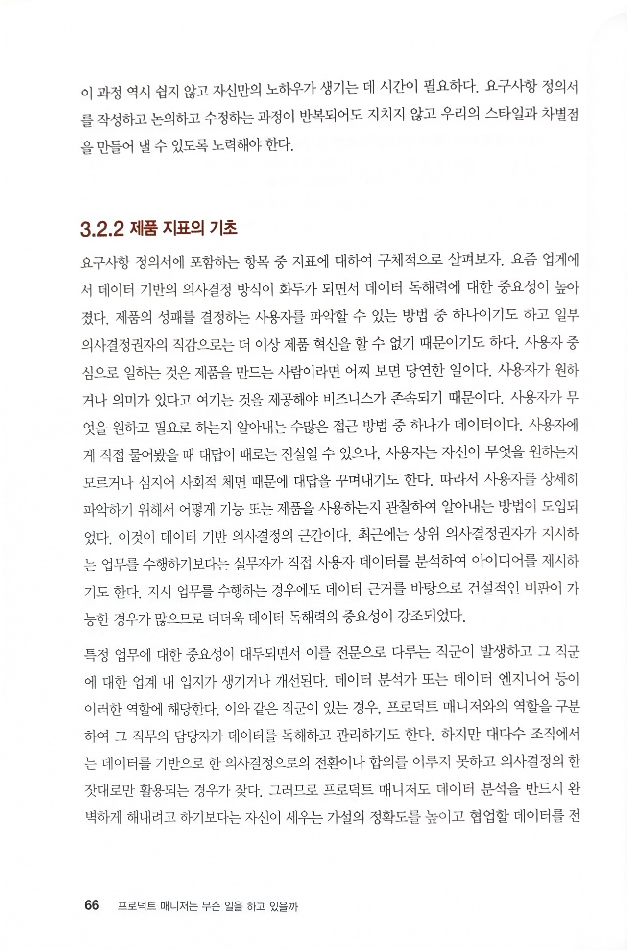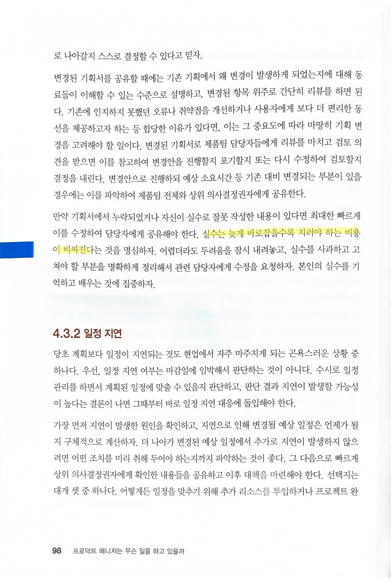 - Agile 전문 서적이 아니니 한계가 있긴 하지만, agile에 대한 언급이 매우 적고, 이에 대해 좀 전문적인 부분은 부족하다. 우리나라가 PO/PM 등의 명칭을 갖는 직책이 늘어나는 건 결국 agile, 특히 scrum의 확산과 직접적으로 연결되어 있는데, 이 분야는 매우 약하다.