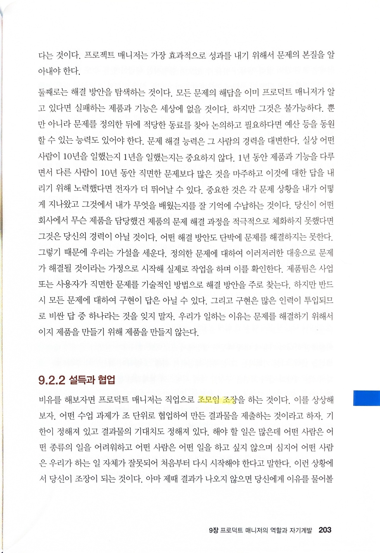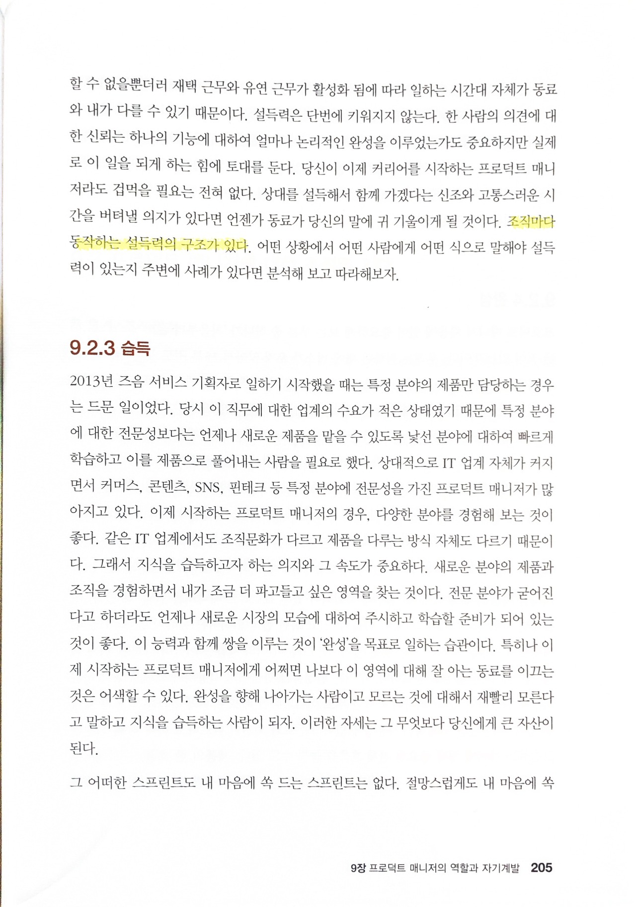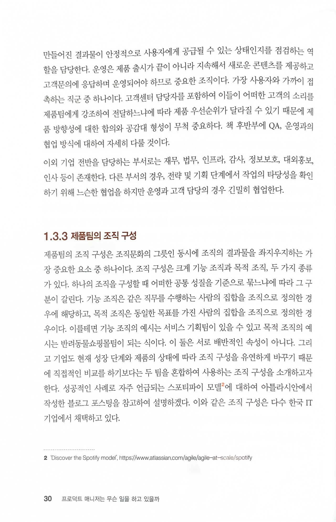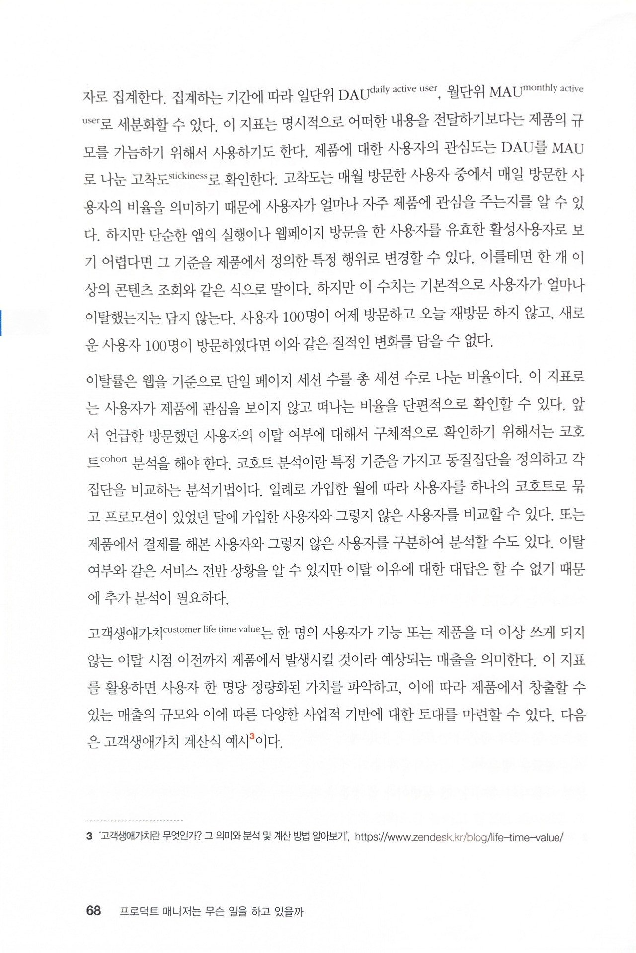 - Agile 전문 서적이 아니니 한계가 있긴 하지만, agile에 대한 언급이 매우 적고, 이에 대해 좀 전문적인 부분은 부족하다. 우리나라가 PO/PM 등의 명칭을 갖는 직책이 늘어나는 건 결국 agile, 특히 scrum의 확산과 직접적으로 연결되어 있는데, 이 분야는 매우 약하다.