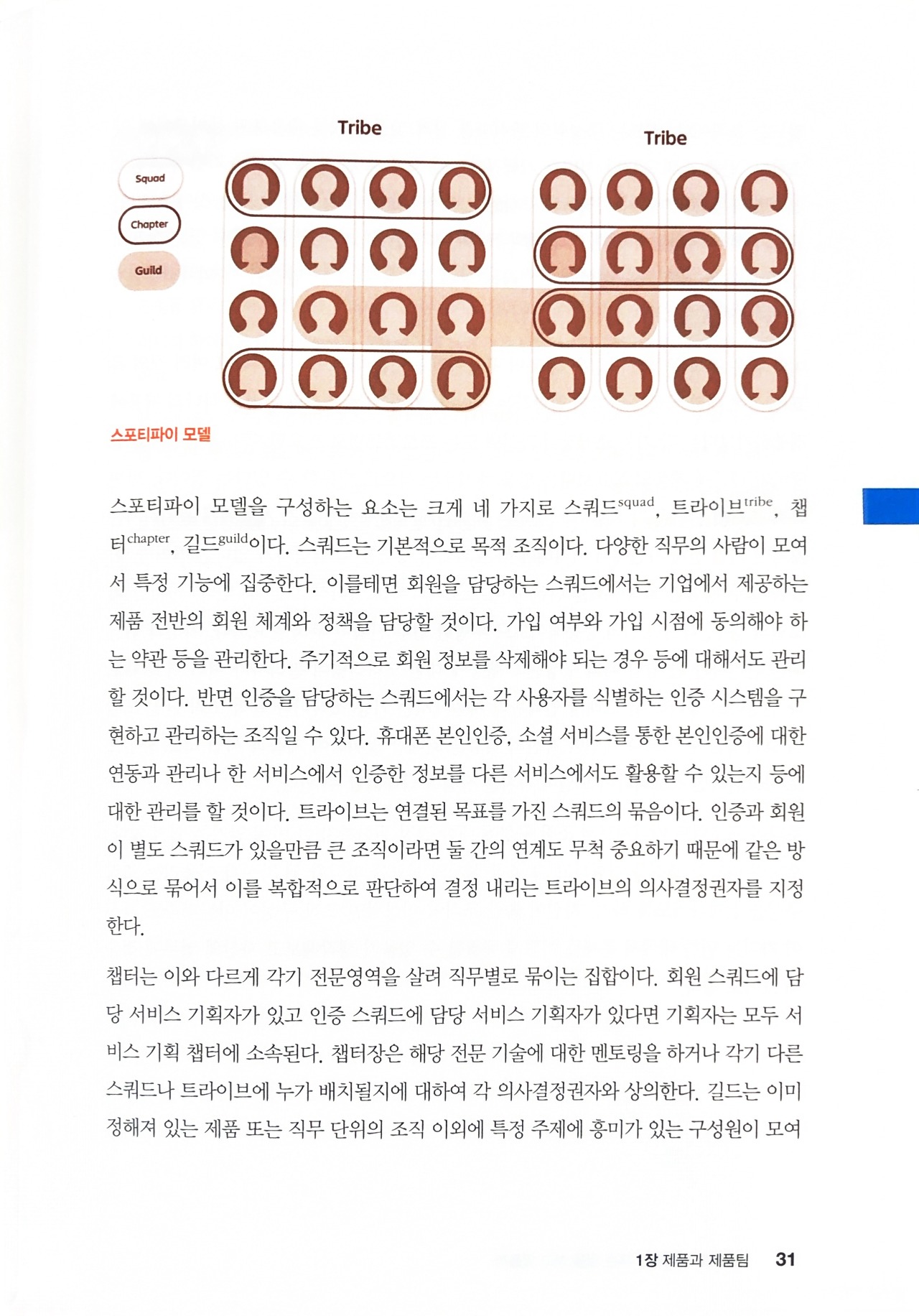 - 어디서나 나오는 스포티파이 모델. 이제 그만 좀 보고 싶다. 성공적인 사례로만 언급하고 왜 스포티파이 모델을 스포티파이가 버렸는지는 모르는지 알지만 숨기는 건지 모르겠지만, matrix 조직의 운영의 어려움에 대해서는 언급한 책이 없다는 현실이 안타깝다.
